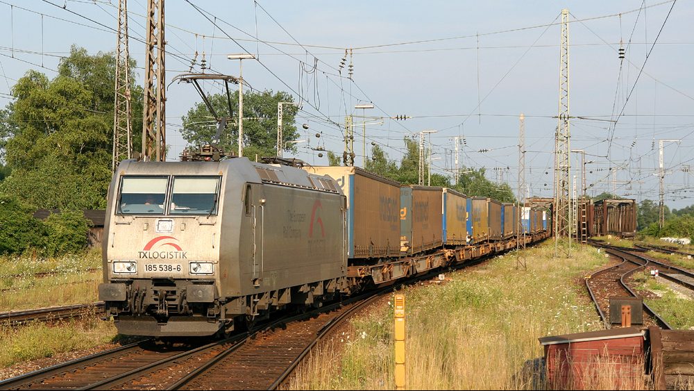 Die gleiche Baureihe dreht als Lok des Logistikunternehmens „TX-Logistic“ ihre Runden.