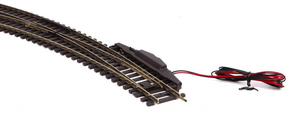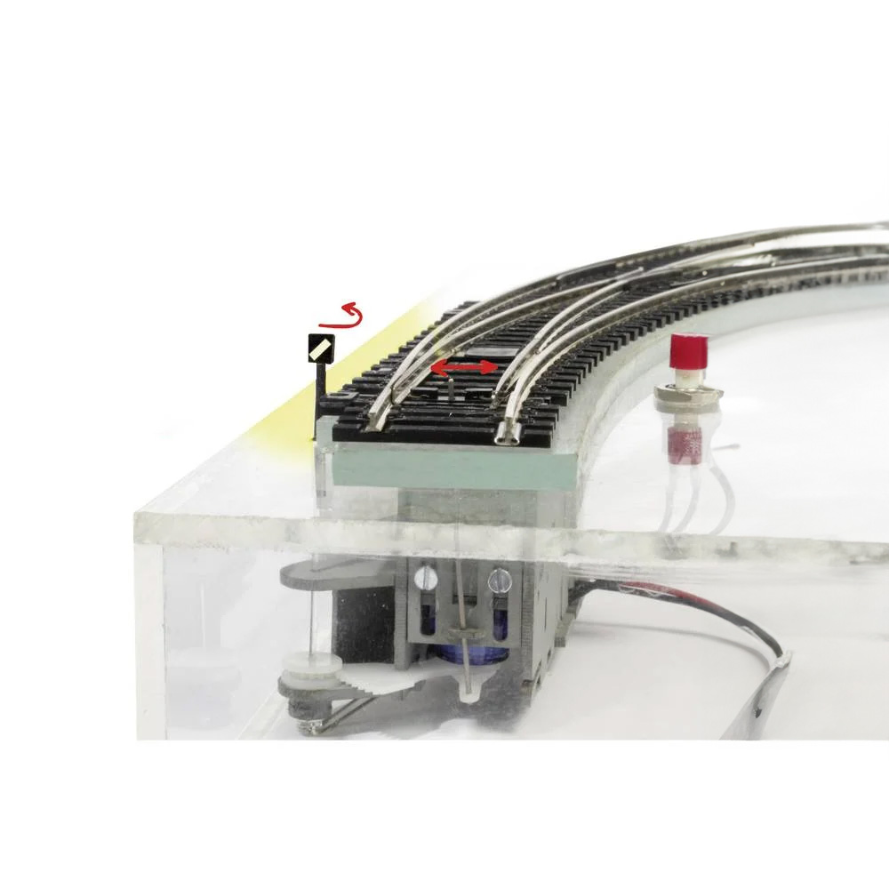 Die Weichen lassen sich ab Werk zunächst nur manuell umstellen. Das ist wenig sinnvoll, insbesondere da auch im hinteren Bereich der Anlage Weichen verbaut sind. Daher ist ein elektrischer Weichenantrieb erforderlich, der die Weichenzunge automatisch bewegen kann. Grundsätzlich gibt es zwei Methoden, diesen Antrieb zu installieren: Entweder wird der Weichenantrieb je nach Hersteller direkt auf der Oberfläche an der Weiche befestigt, oder man bohrt unter der Weiche ein Loch und verwendet einen Unterflurantrieb mit Schubstange.