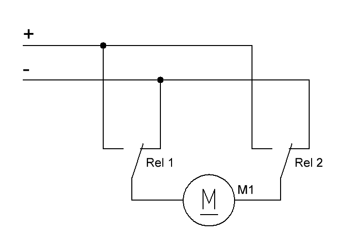 Die H-Brücke ist eine Schaltung, die es ermöglicht, die Polarität einer Gleichstromquelle umzudrehen, um den Stromfluss in beide Richtungen zu steuern. Sie besteht aus vier Schaltelementen, die in einer H-förmigen Anordnung verschaltet sind. In meinem Fall übernehmen zwei Relais diese Funktion: Schaltet das erste Relais, ergibt sich die Polarität + und – am Antrieb, während das zweite Relais die Polarität auf – und + umkehrt. So kann der Conrad-Unterflurantrieb die Weichenzunge zwischen den beiden Endpositionen hin- und herbewegen.