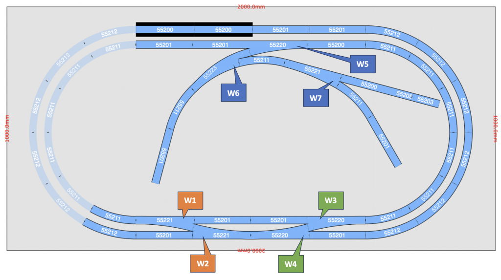 Die Planung der Gleisanlage umfasst auch die Weichen und deren Steuerung. Für die Planung meiner kleinen Anlage habe ich zunächst einen Gleisplan mit dem Traxeditor erstellt. In diesem Programm kann man das gewünschte Gleissystem auswählen – in meinem Fall das Piko A-Gleis ohne Bettung (siehe diesen Post) – und sicherstellen, dass beim Zusammenbau alles korrekt zusammenpasst.