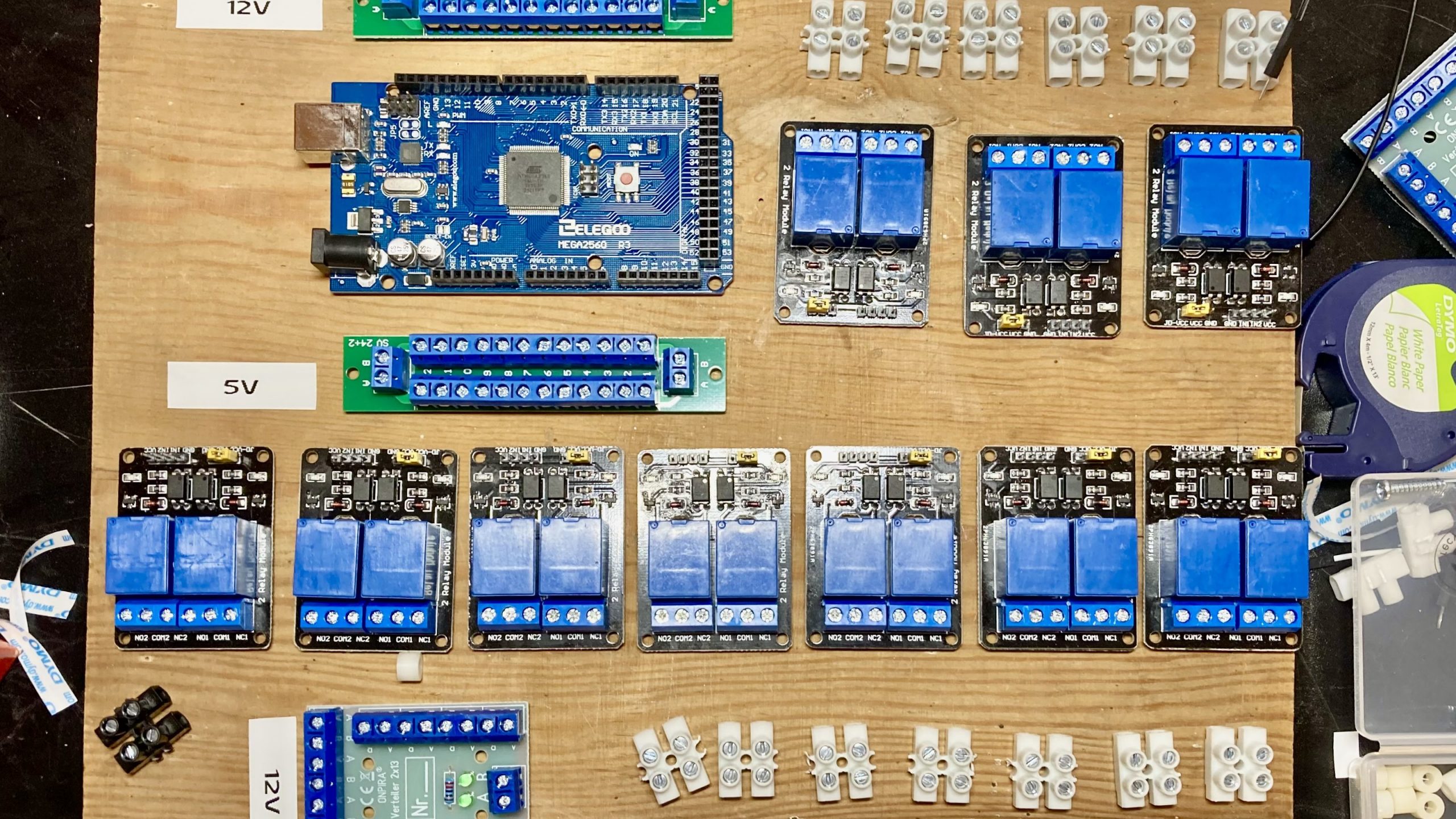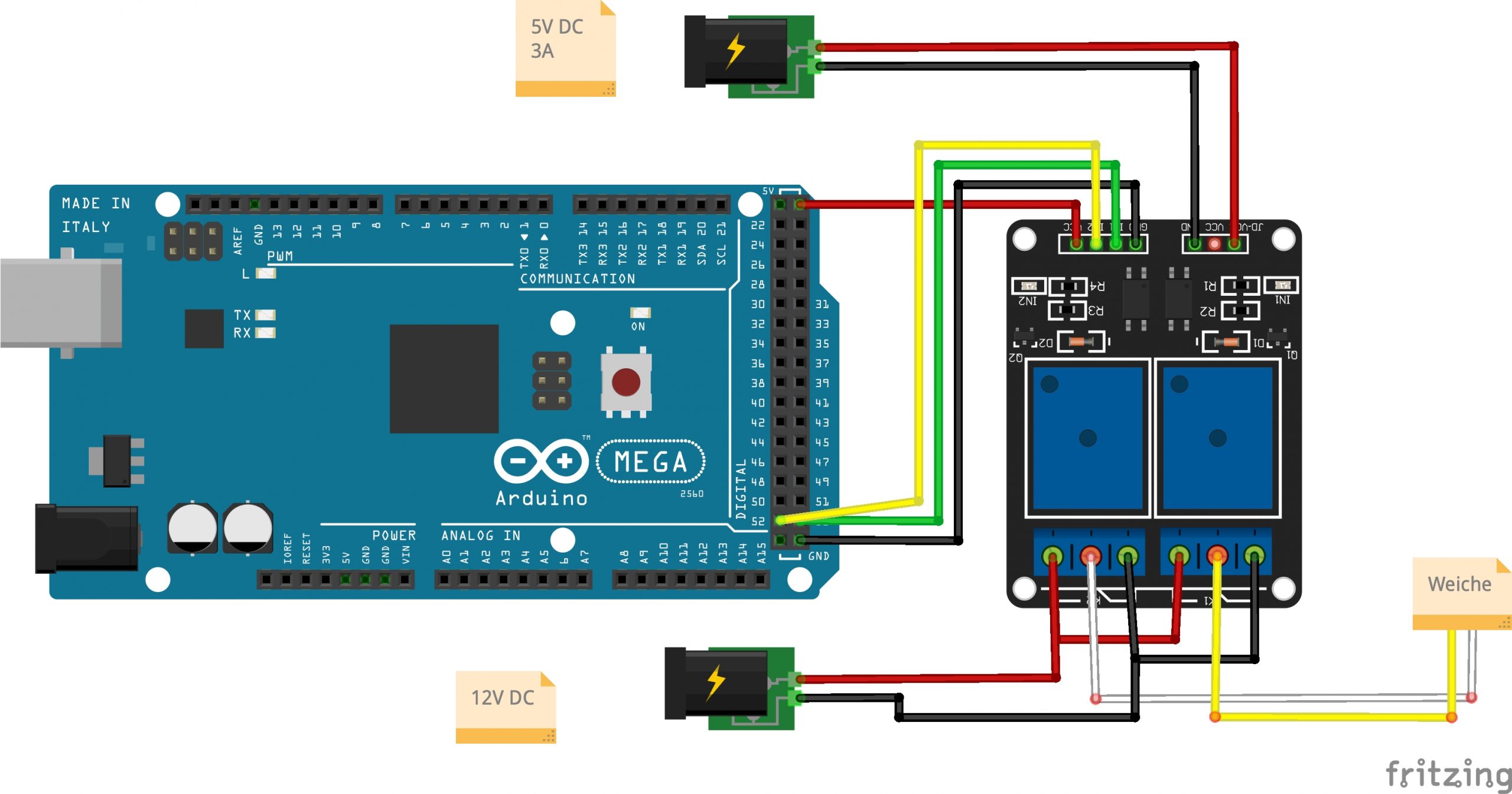 Da mein DCC-Controller leider keine Weichensteuerung unterstützt und ich viele Arduinos und Bauteile zur Verfügung habe, habe ich beschlossen, das Problem selbst zu lösen. Zudem wollte ich eine grafische Oberfläche erstellen, mit der ich sowohl die Weichen als auch andere Funktionen auf der Anlage, wie Lichtabschnitte, steuern kann. Hierfür bot sich eine Kombination aus Processing 4 (zur grafischen Oberfläche auf dem PC) und einem Arduino Mega an.