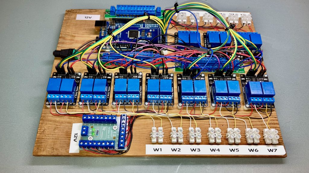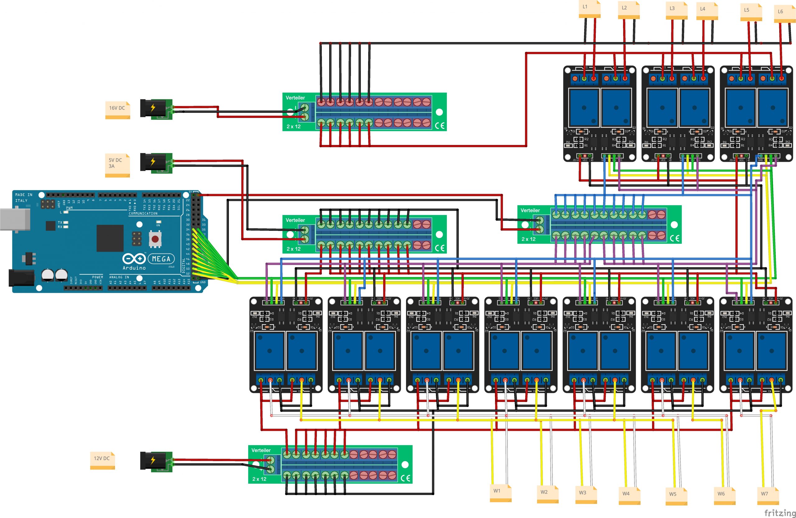 Bevor alle Bauteile zusammengefügt werden, sollte zunächst eine durchdachte Skizze erstellt werden. Diese hilft, Denkfehler zu vermeiden und Kurzschlüsse zu verhindern. Aufgrund der Vielzahl der Relais empfiehlt es sich, ein externes 5V-Netzteil für den Ansteuerungsstrom zu verwenden, da das Arduino-Board nicht genügend Spannung bereitstellen kann, vor allem nicht über USB. Ich habe den Ansteuerungsstrom über eine kleine Stromverteilerplatine verbunden. Da meine Relais etwa 70 mA pro Stück benötigen, ergibt sich bei 20 Relais (14 für Weichen und 6 für Licht) ein Strombedarf von ca. 1,4 A – deutlich zu viel für den Arduino. Die Steuerleitungen ziehen zwar ebenfalls Strom, belasten jedoch die Pins nur mit etwa 3–4 mA pro Relais. Wichtig: Der VCC und GND-Pin, welcher den Optokoppler und die LEDs des Relais steuert, muss trotzdem zusätzlich mit den 5V und GND-Pin des Arduino verbunden werden! Die externe Stromversorgung für die Spule wird am JD-VCC Pin angeschlossen und der Brückenstecker, welcher werkseitig den VCC mit dem JD-VCC-Pin verbindet wird entsprechend vorher entfernt.
