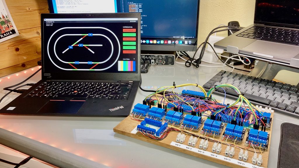 Entsprechend dieser Prinzipien kann man nun die restlichen Buttons ergänzen und den Arduinocode darauf anpassen. Statt einer LED wird einfach das jeweilige Relais geschalten. Statt einem Schalter für rechts und links habe ich nur einen Button verwendet. Dies kann man über eine Variable, welche den jeweiligen aktuellen Status der Weiche enthält realisieren. Das senden des jeweiligen Befehls an den Arduino erfolgt mittels einem ternären Operator (Konditionale Zuweisung).